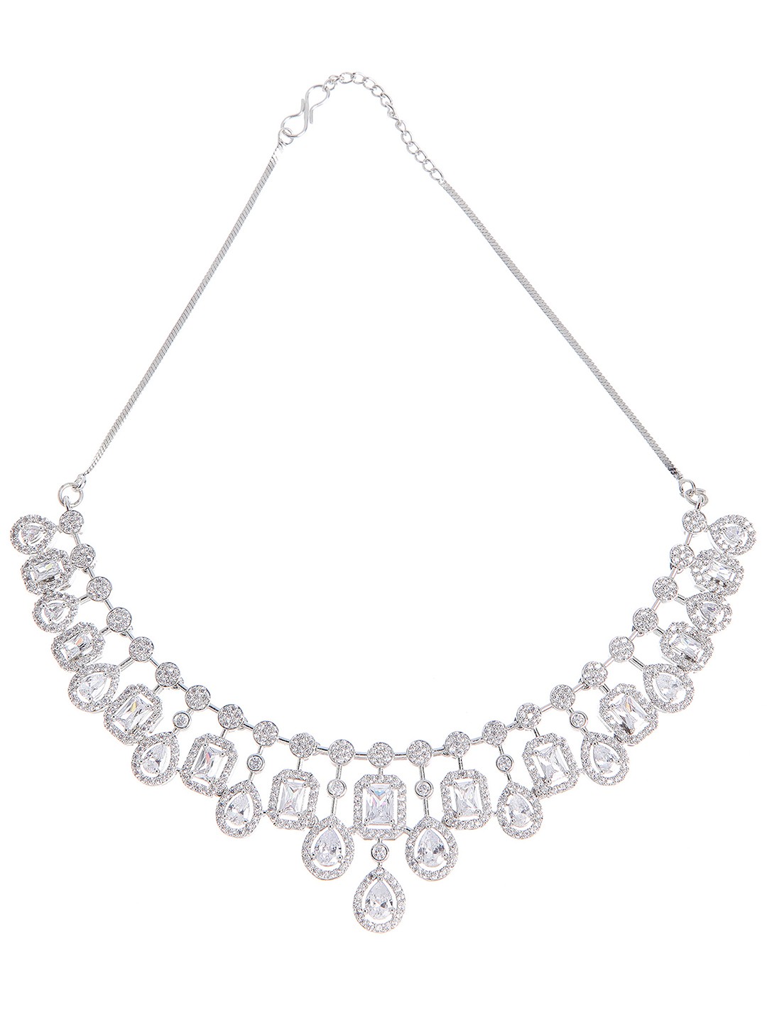 Silver-plated handcrafted necklace, has white Cubic Zirconia and American Diamond studded design detail